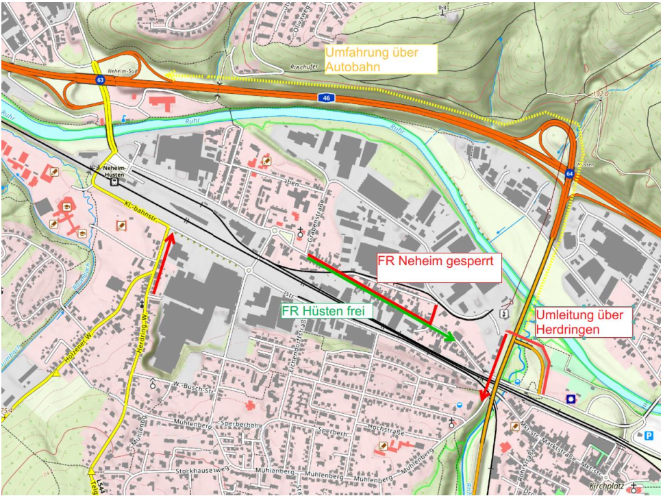 Das bedeutet, dass ab dem 13. April 2026 für die Arbeiten in der Gewerkschaftsstraße die Fahrtrichtung Neheim über die Bahnhofstraße und Hüttenstraße gesperrt ist. Die Fahrtrichtung Hüsten über die Bahnhofstraße bleibt wie bisher weiter möglich. Die Hüttenstraße kann aus Richtung Neheim kommend über die Grabenstraße angefahren werden. Die offizielle Umleitung in Fahrtrichtung Neheim erfolgt über die B229 und Herdringen, da eine Umleitungsbeschilderung über die Autobahn nicht zulässig ist.